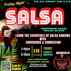 Learn how to lead and follow with confidence and connection! Group class focuses on Salsa ("New York Style") on 2 style technique for footwork and partnerwork. you do not need a partner to attend class. TO REGISTER: https://secure.rec1.com/GA/kennesaw-ga/catalog Class located under Salsa Dancing. *Classes held on the first and third Fridays of every month. *You may also register in person at the front desk of Ben Robertson Community Center